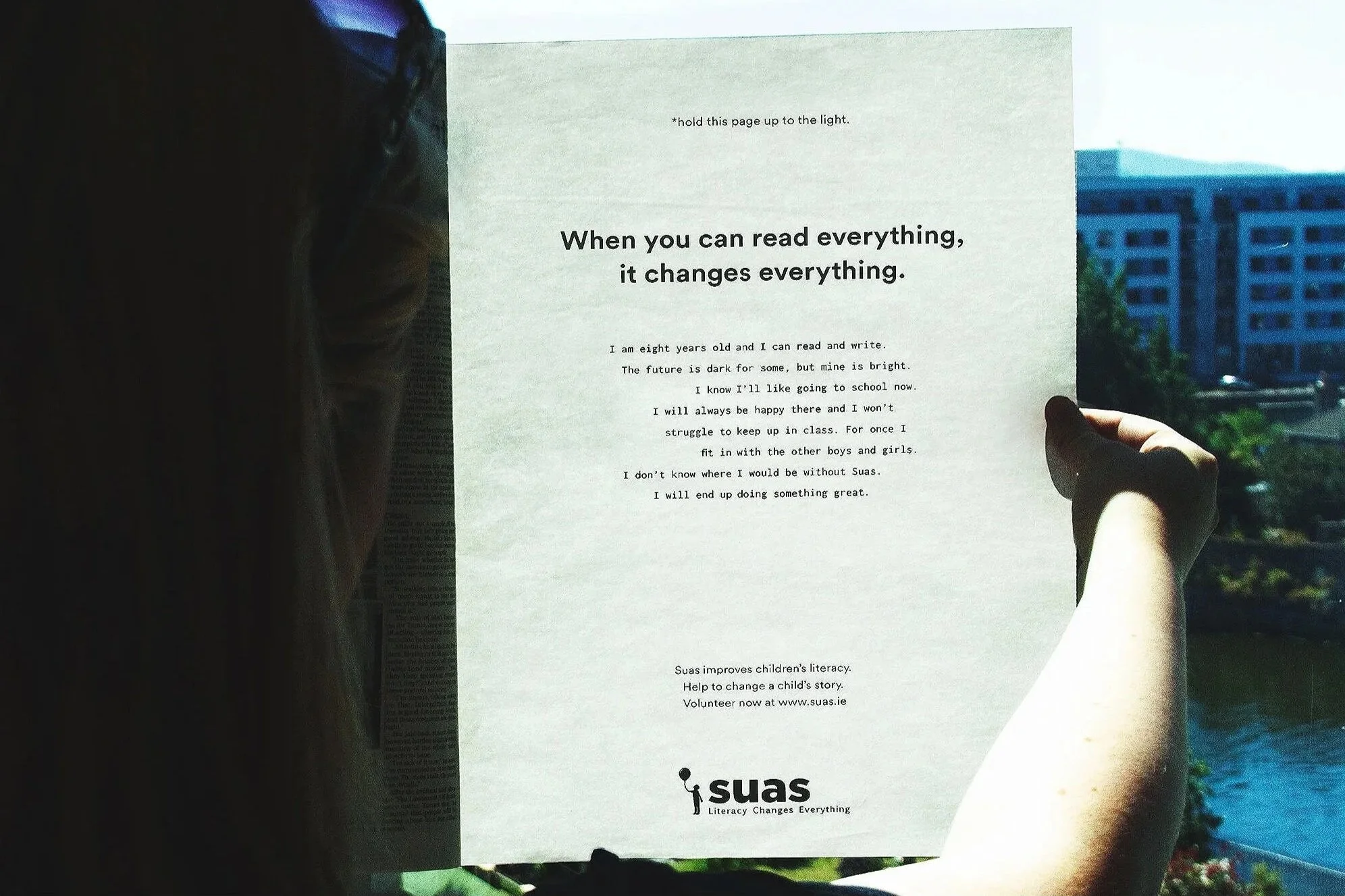 Learning to read and write opens up a world of opportunities. Our campaign “When you can read everything, it changes everything” demonstrates that literacy has the power to change the lives of children. The two-sided newspaper ad contains a story, half of which is printed on one page and the other half is printed on the back. When the page is read normally the text tells the struggles of an illiterate child, however when held up to the light the message revealed is a positive one of what can be achieved when you can read everything. We wanted to show potential volunteers and donors the difference they could make to a child’s life by simply helping them learn to read. Thanks to the thin newsprint paper, when the ad is held up to the light, the extra words change the story entirely – from a negative to a positive.