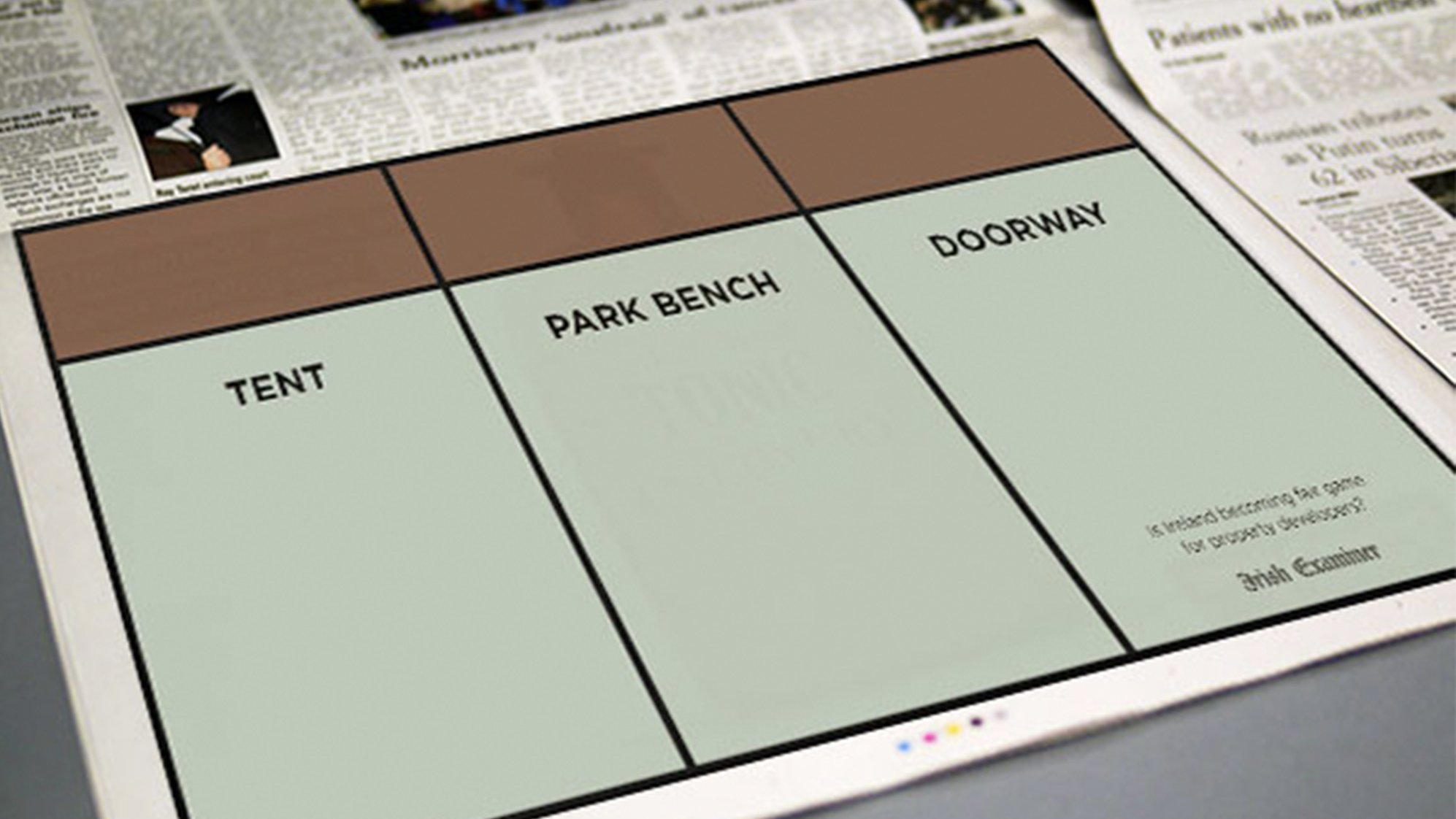 In response to this, we created a series of print ads that uses the monopoly board as a symbol that we feel massively reflects the real-life housing crisis.